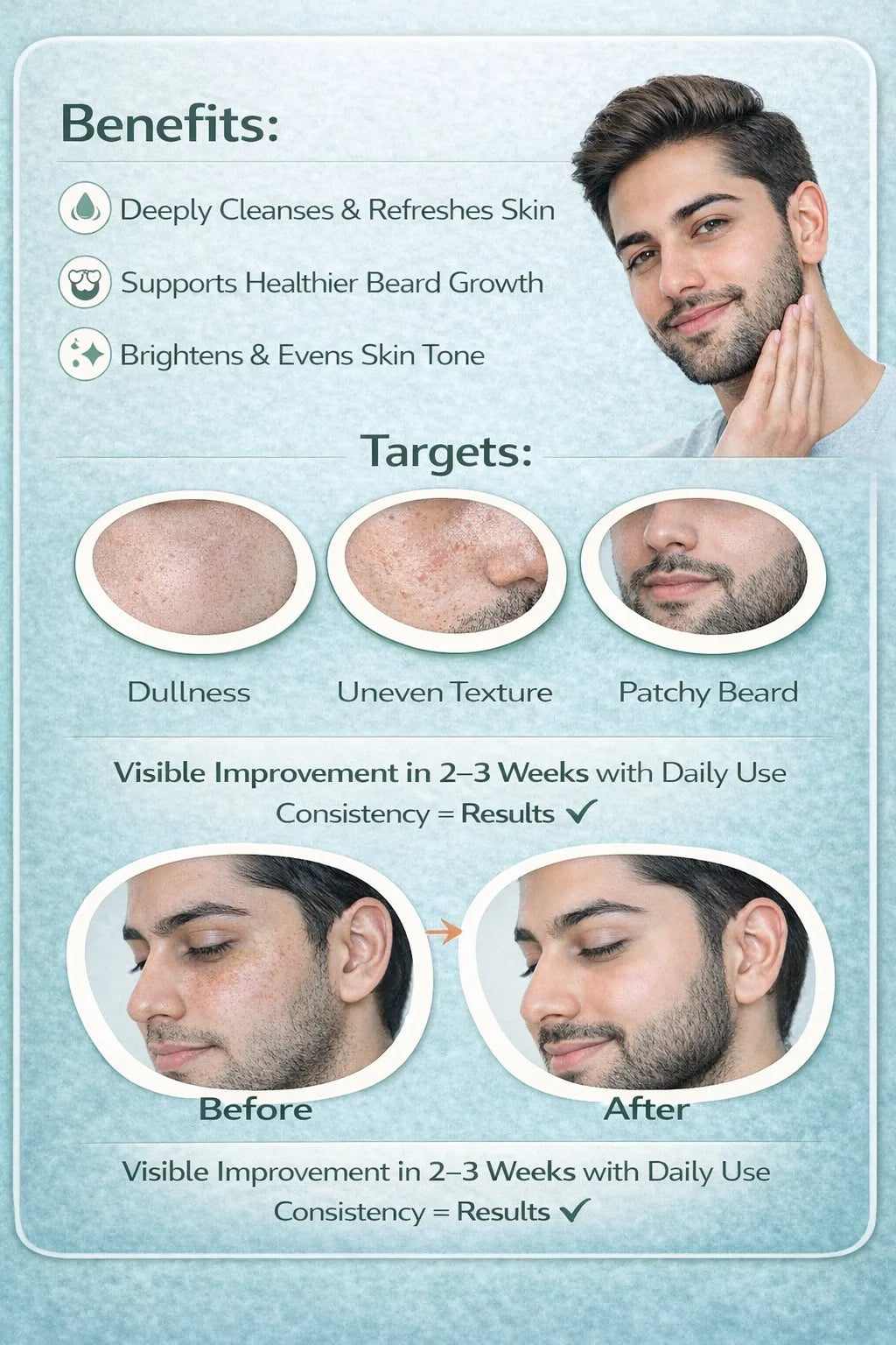 Skin feels fresh immediately. Visible brightening & beard improvement with consistent use.