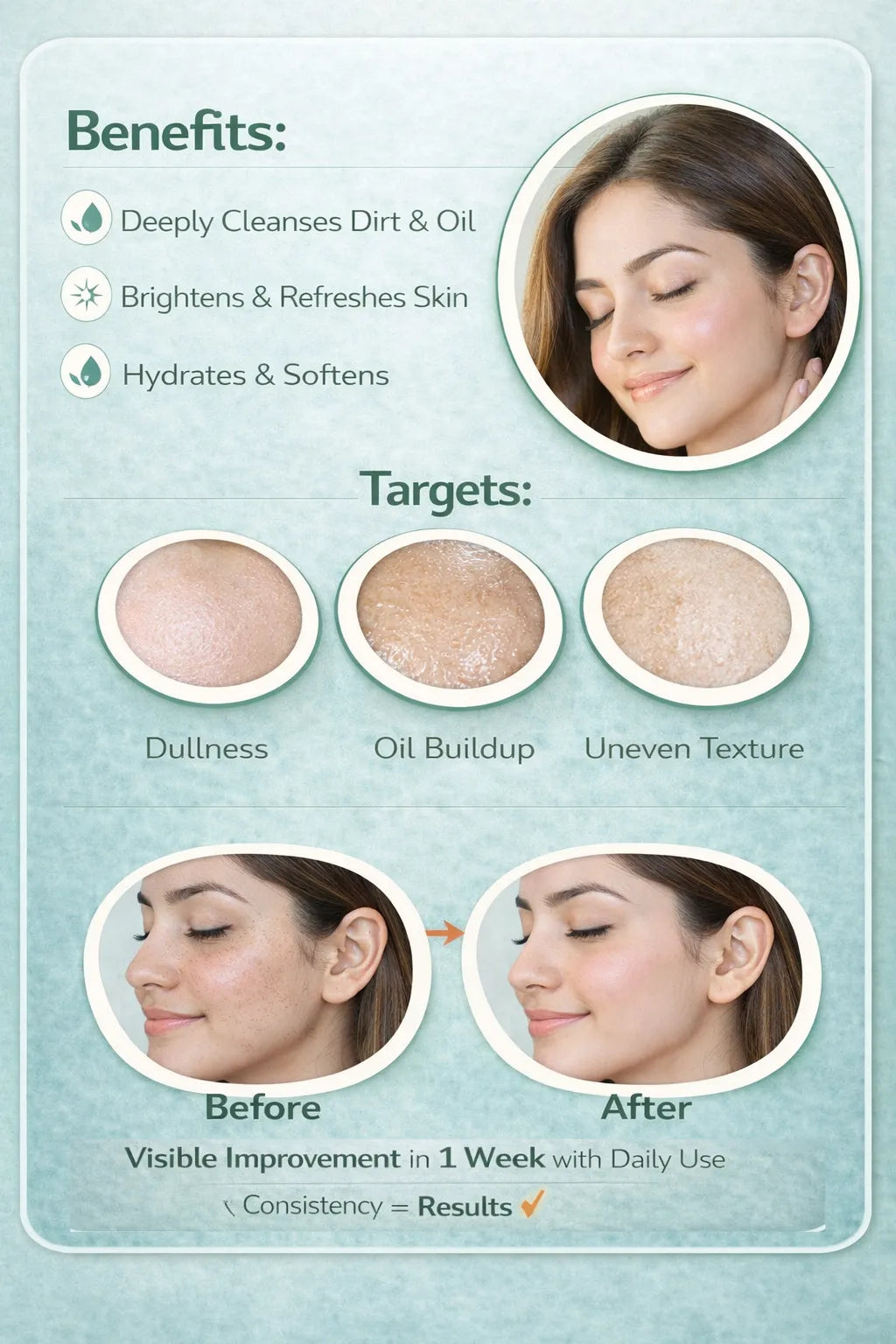 Gently removes daily buildup, pollution, dust, and excess oil while keeping your skin comfortable and smooth, perfect for Pakistani weather conditions.